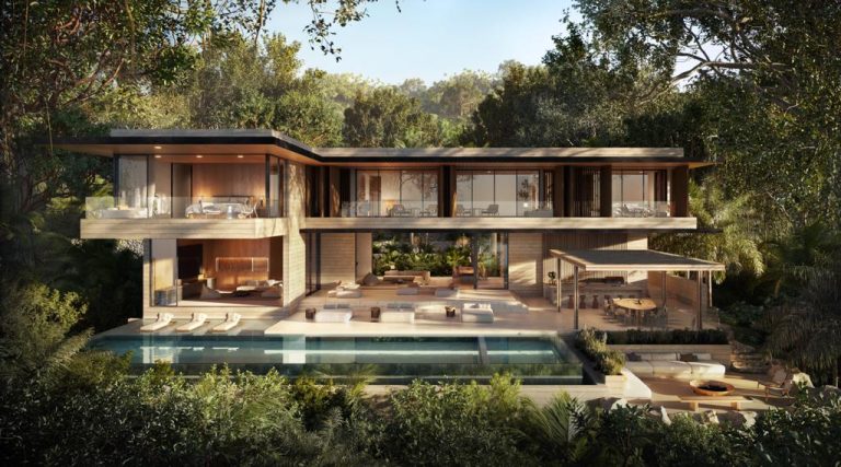NAUKA: LOTE 3 Muro de contención, escaleras, andadores y jardineras. Área de construcción: Lote 3. Casa principal y casa adicional: 1,456 m² Altura: 8.40 m. Ubicación: Nayarit, México. ANTERIOR OBRAS EN PROCESO SIGUIENTE
